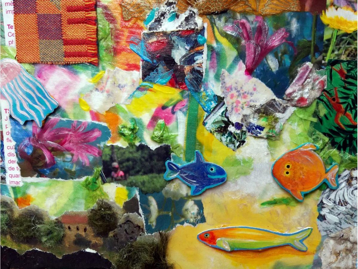 Collage tactile (papier, papier mâché, tissus, molleton, laine, module en relief) rehaussé à l'acrylique, soleil mobile (spirale métallique), inclusions de braille. Date et signature au recto, logo au verso.